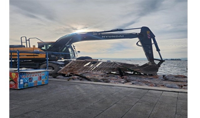 İzmir Büyükşehir Belediyesi, Karşıyaka sahilinde Kıyı ve İmar Kanunu’na aykırı şekilde inşa edilen izinsiz platform ve ahşap iskelelerin yıkımına başladı.