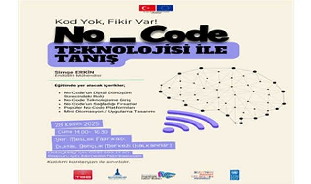 İzmir Büyükşehir Belediyesi Meslek Fabrikası, 28 Kasım’da kod yazmadan mobil uygulamalar veya arayüzler geliştirilmesini sağlayan No-Code teknolojisi eğitimi verecek. Endüstri mühendisi tarafından verilecek eğitimlere 16-30 yaş aralığındaki gençler başvurabiliyor.